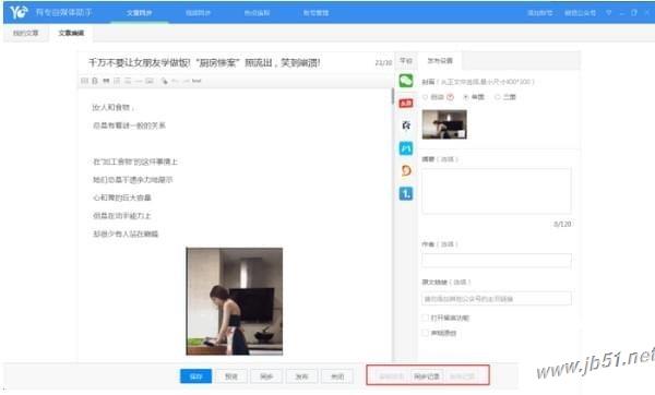 其中左侧为文章标题和内容的编辑区域。右侧为文章设置区域,可以在这里设置文章封面,以及各个自媒体平台对应的设置信息。下方为操作按钮,可以进行文章保存,同步,发布,预览,关闭等操作。
