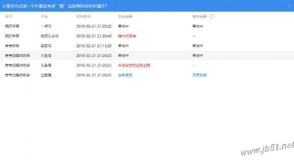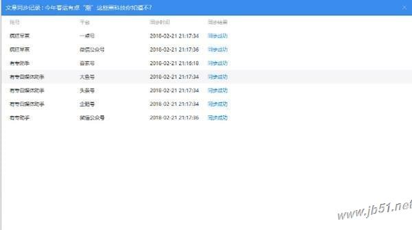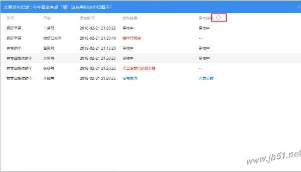 当您对文章进行同步或发布操作后,您可以在我的文章或文章编辑页面中查看该文章的同步记录和发布记录,对于具有审核机制的平台,您可以通过审核状态按钮来查看文章是否审核通过。如下图所示: