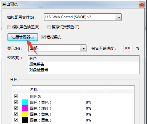 6、点击了输出预览的窗口中的油墨管理器的按钮。