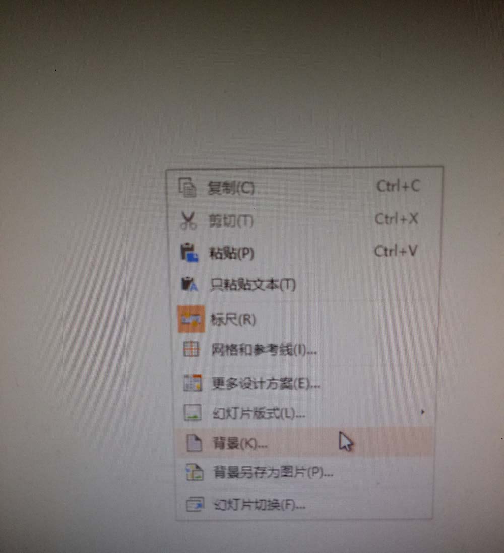 1、新建一个PPT文件,单击右键,在弹出的菜单中选择背景