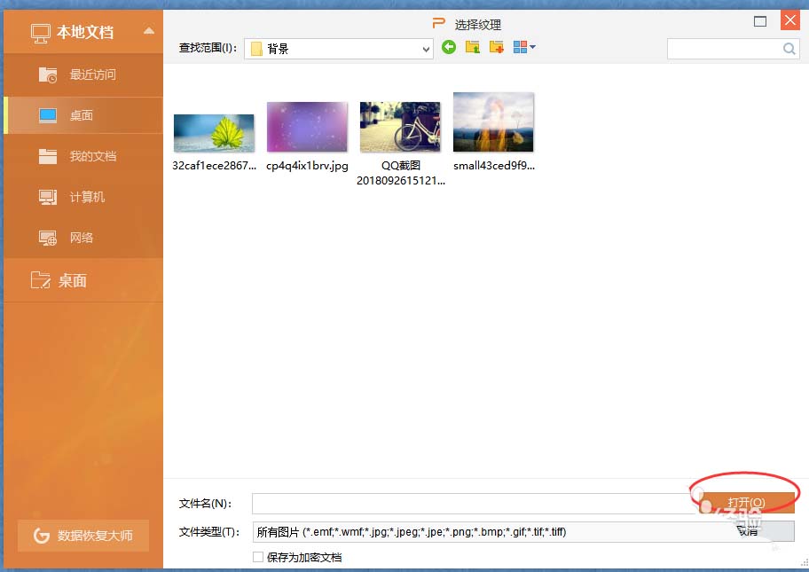2、在右侧打开的窗格中选择“图片或纹理填充”,然后点击“本地文件",选择一张喜欢的图片插入到幻灯片背景中。