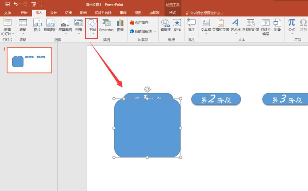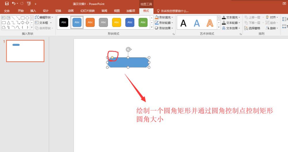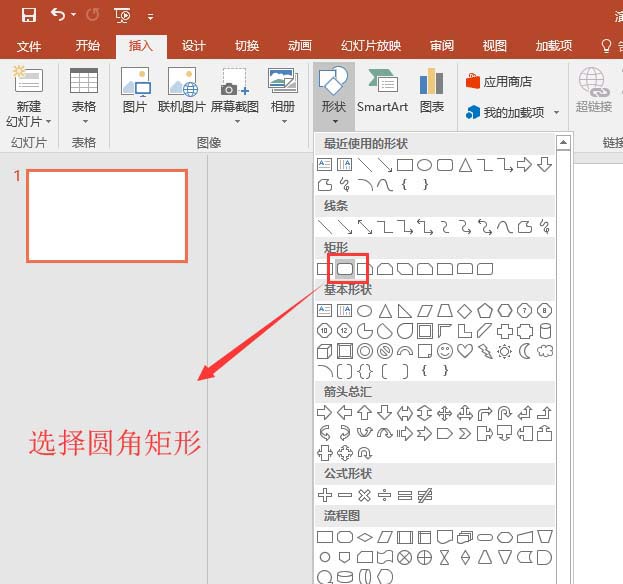 2、选择插入菜单中的形状命令,在形状中选择圆角矩形,然后用鼠标左键在幻灯片页上画出一个大小合适的圆角矩形,并通过圆角控制点来调整圆角的大小。