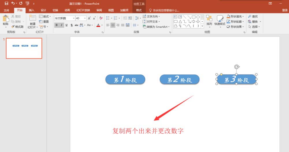 4、选中圆角矩形与文字内容,按住键盘上的shift键和Ctrl键,水平复制两份出来,然后分别将复制的两份中的数字改为2和3.