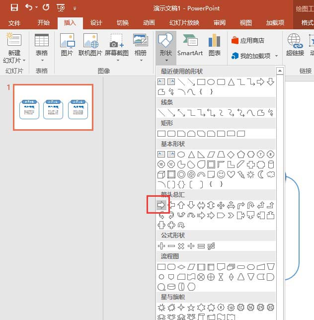 7、在选择插入菜单中的形状,在形状中找到向右的箭头;在两个阶段之间插入一个箭头,调整好大小与位置,然后在水平移动复制一个。这样,我们就在PPT 2016中做好了一个进阶图示的案例。