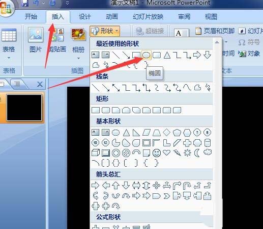 2、接下来点击插入选项卡,点击形状,再点击椭圆,绘制出一个圆形。再点击格式选项卡,点击形状轮廓,选择无轮廓。