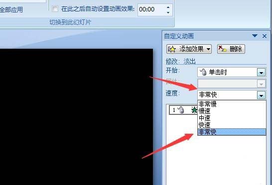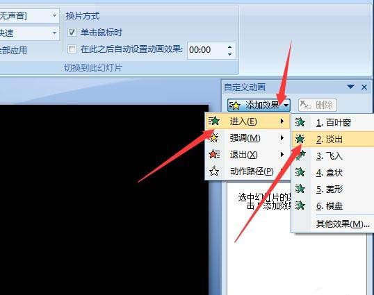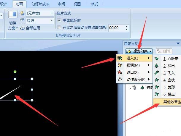 6、接下来选中圆形,点击动画,自定义动画。在右侧的窗格中点击添加效果,进入,淡出效果。再设置速度为非常快。