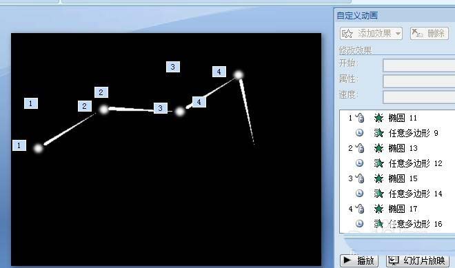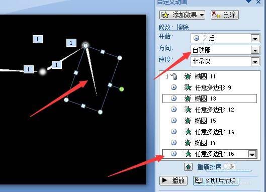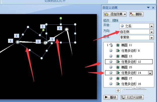 10、再选中中间两长条形状的进入动作,点击方向处改为自左侧。再选中最后一个长条形状,设置方向为自顶部。好了,播放一下看看,星阵图的动画效果就出来了。