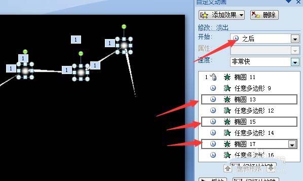 9、同样的方式粘贴多几个出来,移动好位置与旋转好角度。选中三个圆的进入动作,设置开始为之后。如图