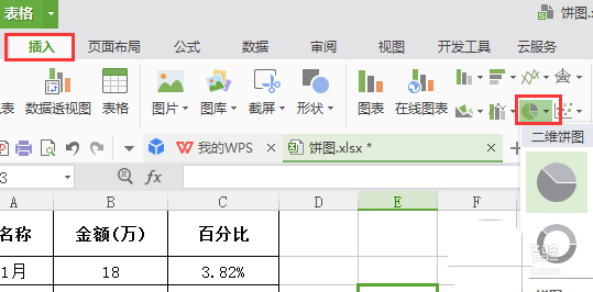 1、找到“饼图”:点击菜单栏“插入”,则可看见饼图图标。