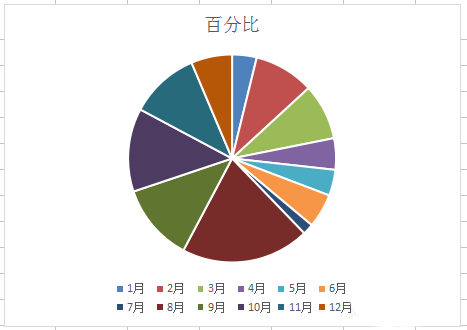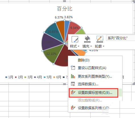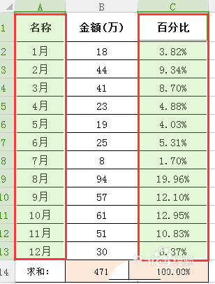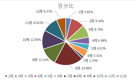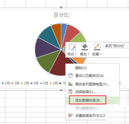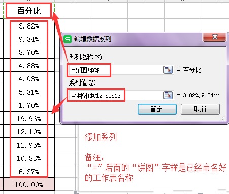 2)添加系列。系列名称即为“百分比”,系列值是每月金额所占百分比。