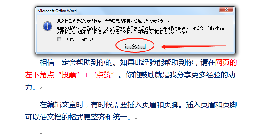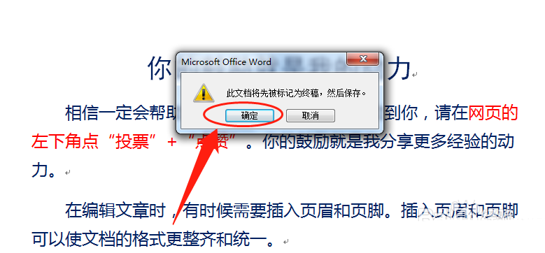 4、弹出提示框,单击“确定”按钮,确认标记为最终稿。