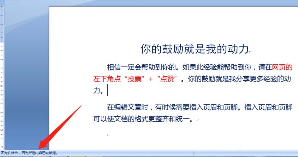 6、再次打开文档要进行编辑时,文档左下角提示“不允许修改,因为所选内容已被锁定。”,无法进行编辑。