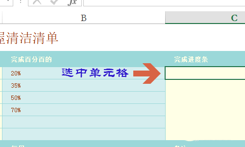 1、首先我们选中某个单元格,也就是想要插入进度条的那个单元格,如下图所示...