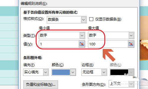 4、接着就会弹出“新建格式规则”对话框了,我们在该对话框将“类型”由自动更改为数字,然后最小值和最大值分别设置为1和100;