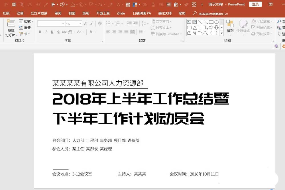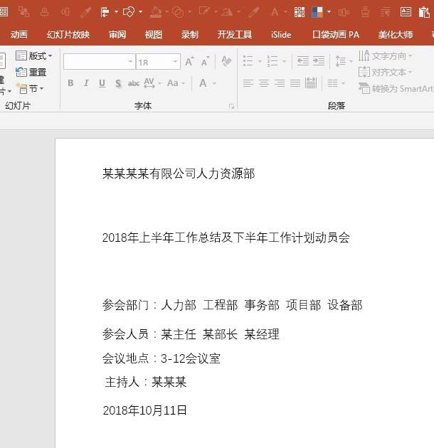 4、重要一点的会议,还要再插入单独的文本框,再输入参会部门、参会人员、会议地点、主持人等等。