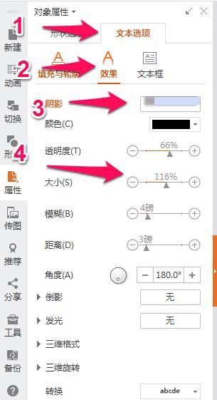 5、然后继续设置【文本选项】的【效果】面板,给字体添加一个向左的阴影,然后设置阴影效果大小到合适大小,大家可以自己试试,小编这里设置的是116%,如下图: