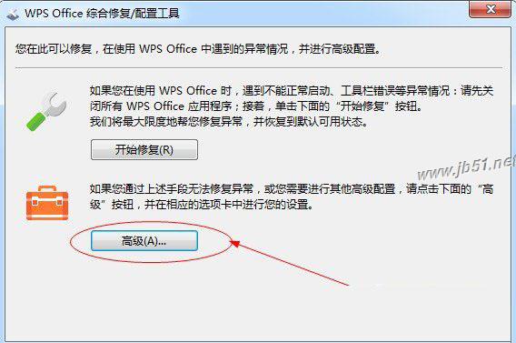4、进去之后可以看到弹出一个新的对话框【wps office 综合修复/配置工具】,选择【高级】;