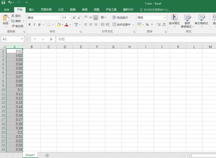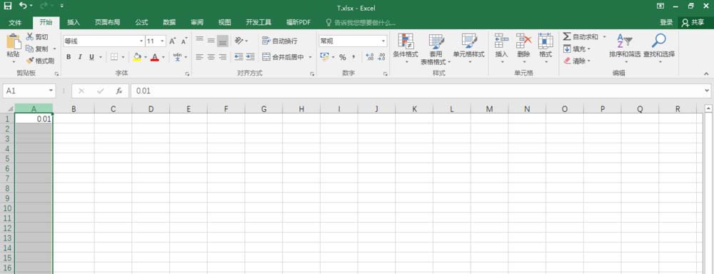 1、打开Excel2016(其他版本的软件参照),在A1单元格输入0.01,选中A列