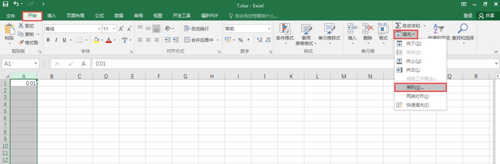 2、以此点击“开始”、“填充”、“序列”