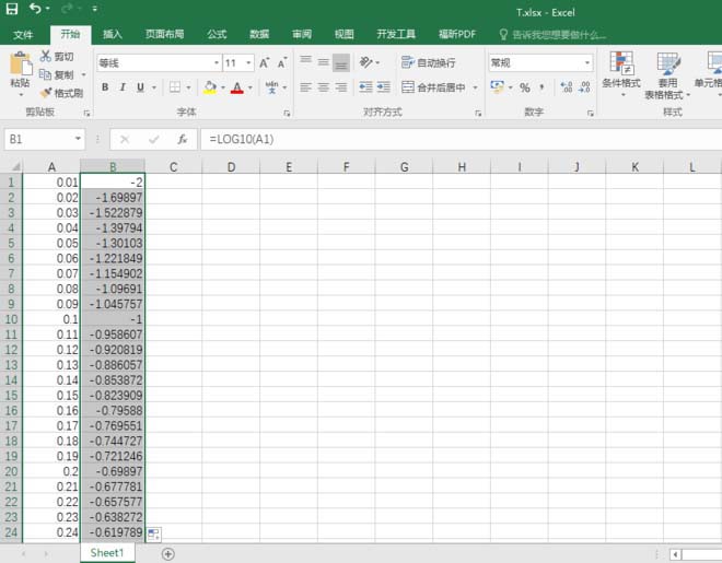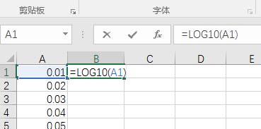 5、在B1单元格输入“=LOG10(A1)”,即求出以10为底的对数函数值