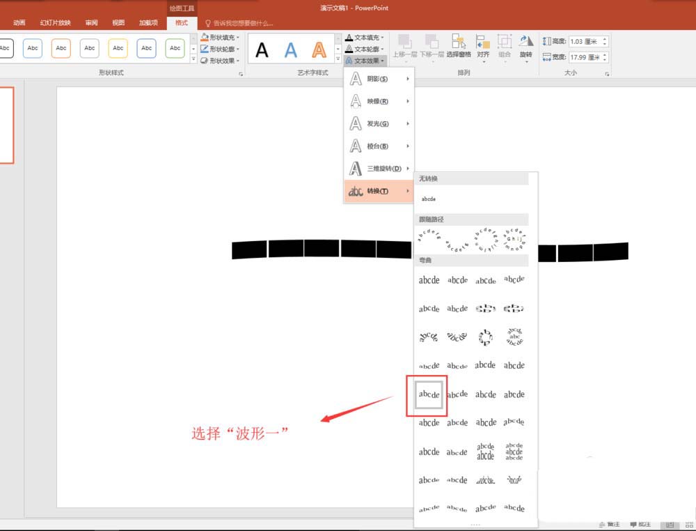 3、保持选中文本框的状态,切换到格式菜单中,在格式菜单中找到文本效果,在文本效果中找到转换中“波形一”效果,单击应用到文本框的文字内容上。