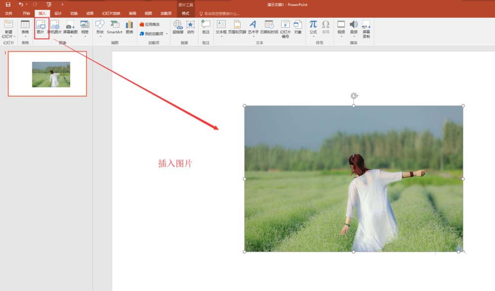 5、切换到插入菜单栏中,在插入菜单栏中找到图片命令,单击图片弹出插入图片窗口,在插入图片窗口中找到我们要插入的图片,单击插入的幻灯片页中。