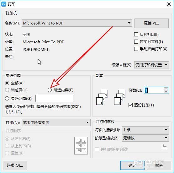 6、这时就会弹出wps2019的打印设置窗口,在窗口中选中“所选内容”设置项,最后点击确定按钮就可以了。这样我们就可以只打印选中的内容了。