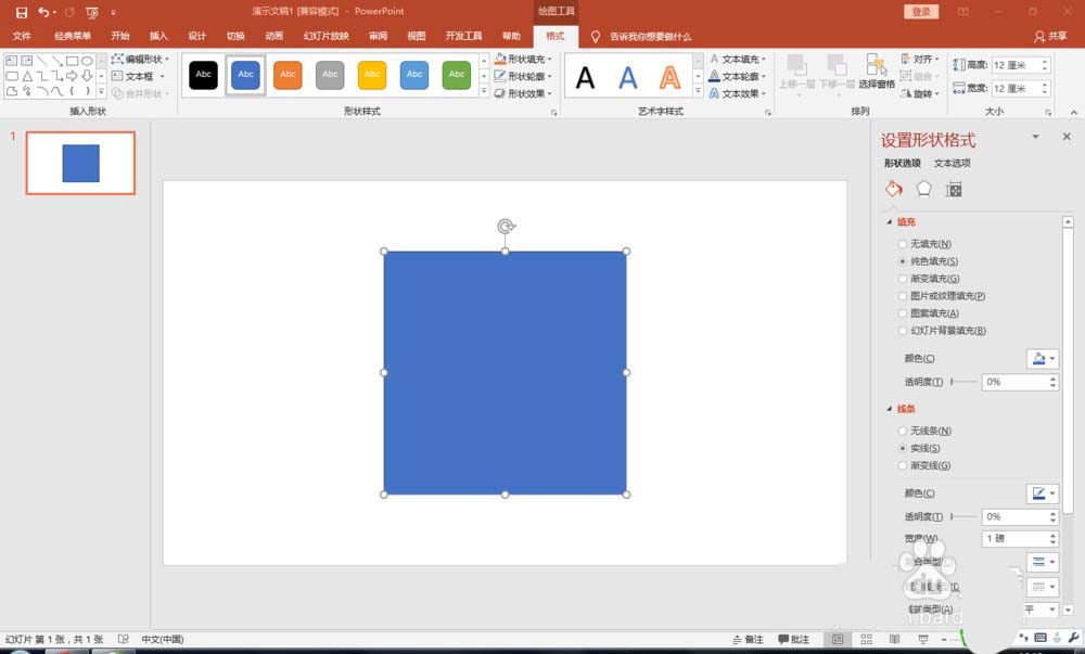 1、打开PPT,“插入”“形状”“矩形”,画出正方形,边长12厘米。