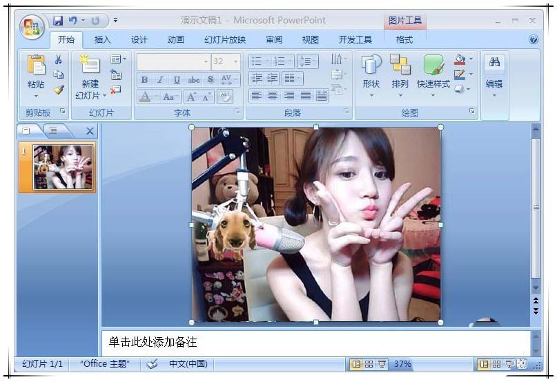 1、打开PowerPoint,在第一张幻灯片中插入一张图片,并拖动图牌放大到满屏状态,用于模拟主播视频画面。