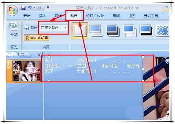 4、然后为文字添加动画效果,选中文本框,工具栏中切换到“动画”选项卡,“动画”下拉框中,选择“自定义动画”。