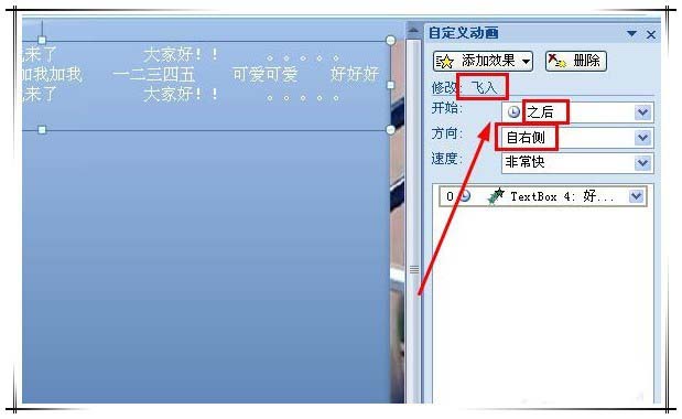 5、在右侧“自定义动画”窗口中,为文本框添加“飞入”效果,开始方式为“之后”,方向为“自右侧”。这时按下“播放”按钮,可以看到PPT已经有了初步的弹幕效果,但是弹幕的速度太快,一闪而过了。