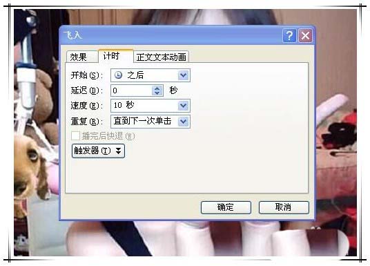 7、如图所示点击动画后的下拉框,选择“效果选项”,在打开的窗口中,切换到“计时”页面,在“速度”选项后的文本框中直接输入“10”,并在“重复”选项中选择“直到下一次单击”,确定保存。