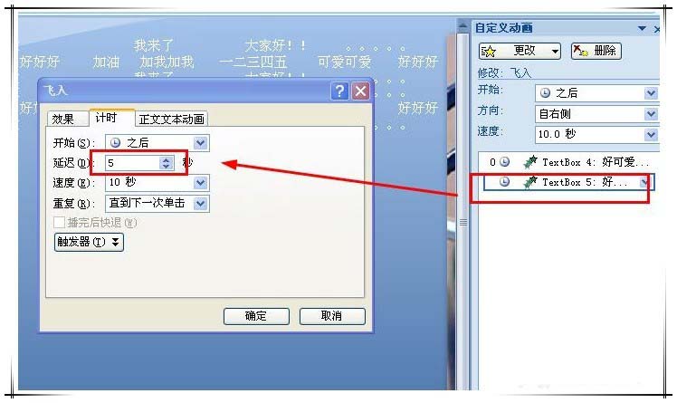 8、再将文字复制一份,略调整一点位置,将在“计时”页面,将延时修改为5秒,这样,就可以在幕布是时时看到弹幕了。