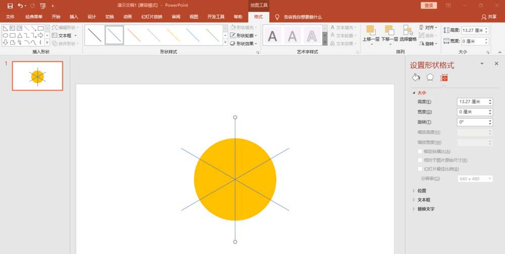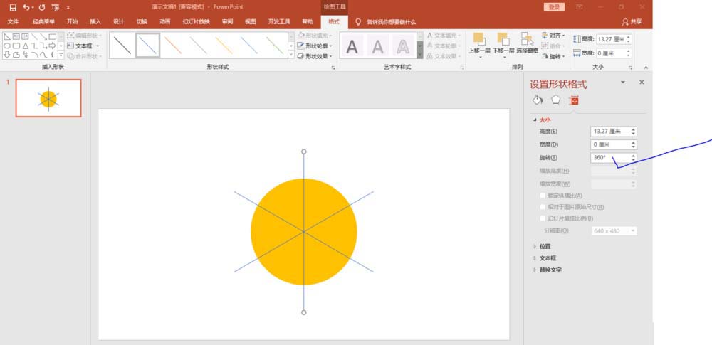 8、选取一条直线,执行“绘图工具”“格式”中的“旋转”,旋转的度数分别是与圆等分相应的度数(计算得出)的倍数。