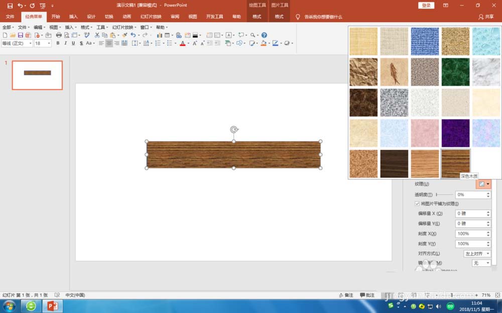 2、为矩形设置格式:边框设为深褐色、填充颜色为“图片和纹理填充”中的“深色木质”。