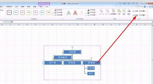 5、按住shift键的时候同时选中一级部门,然后通过格式中的高度和宽度改变文本框的大小。