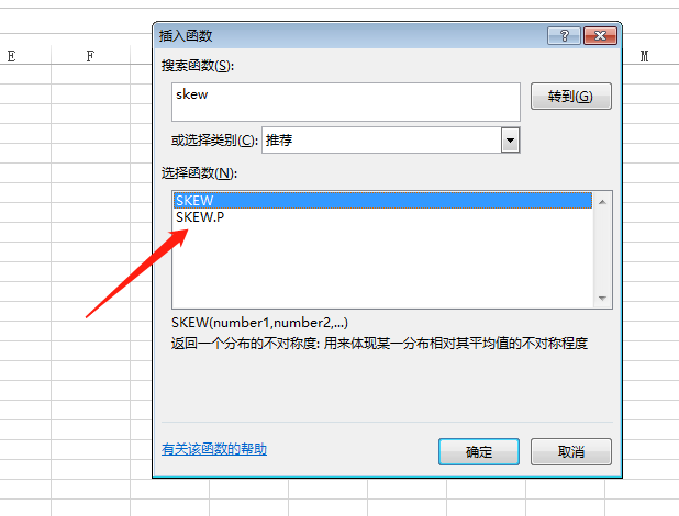 3、弹出函数对话框,我们在输入框内输入“skew”,点击查找函数;