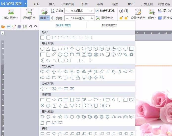 6、单击“裁剪”按钮,可以按照形状裁剪,也可以按照比例裁剪。