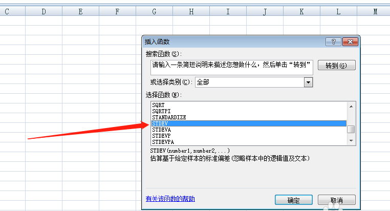 3、弹出函数搜索框,在输入框内输入“STDEV”,点击查找函数;