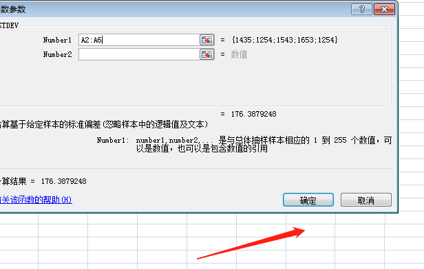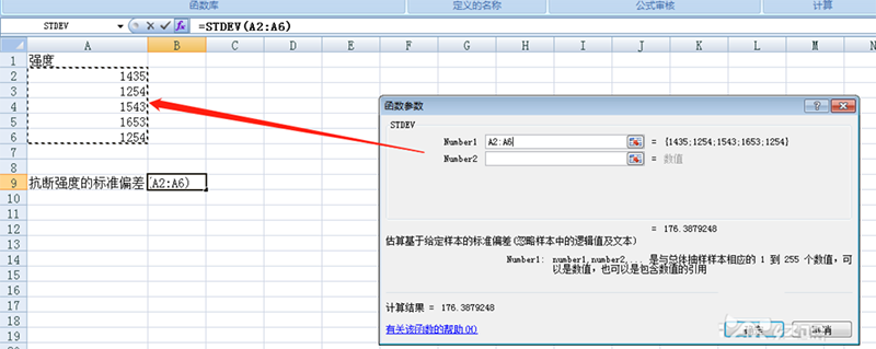 4、接下来设置函数参数,在number处输入要求值的区域A2:A6;