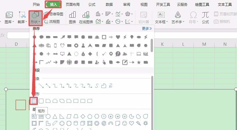 1、切换到【插入】选项卡,点击【形状】下方的倒三角,从弹出的列表中选择【矩形】选项。