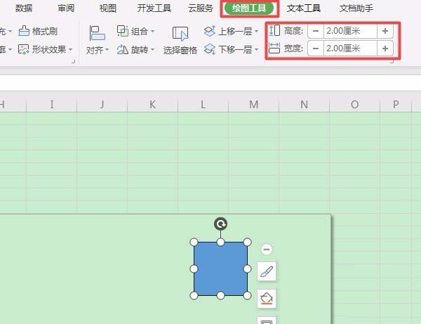 2、在工作表中单击鼠标左键,此时插入了一个矩形,选中该矩形,任务栏就会切换到【绘图工具】栏,在【高度】和【宽度】微调框中将矩形的高度和宽度统一调整为“2.0厘米”。