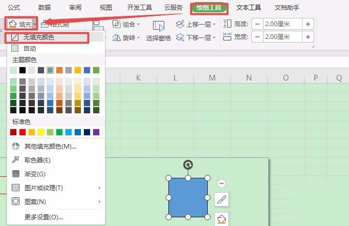 3、选中该矩形,任务栏切换到【绘图工具】栏,单击【填充】按钮右面的倒三角按钮,从弹出的下拉列表中选择【无填充颜色】选项。