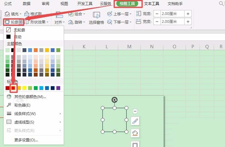 4、单击【轮廓】按钮右面的倒三角按钮,从弹出的下拉列表中选择【红色】选项。