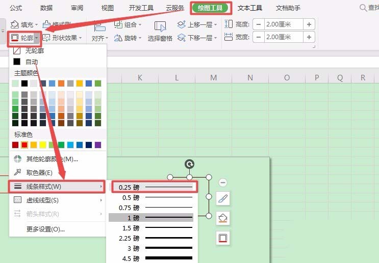 5、单击【轮廓】按钮右面的倒三角按钮,从弹出的下拉列表中选择【线条样式】,再选择【0.25磅】。