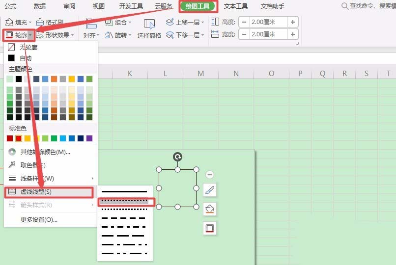 6、单击【轮廓】按钮右面的倒三角按钮,从弹出的下拉列表里选择【虚线类型】,选择【圆点】类型。