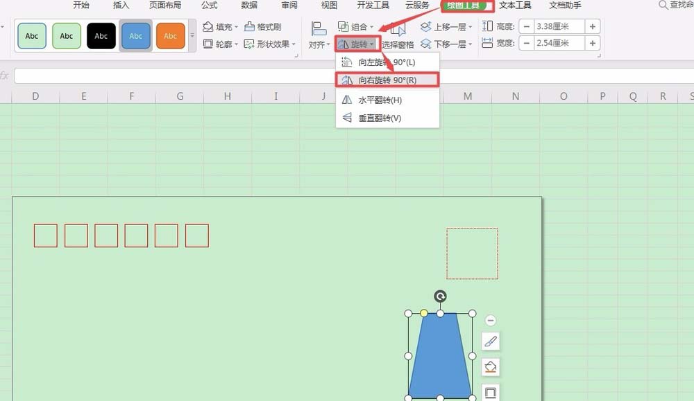 3、选中该梯形,菜单栏就会切换到【绘图工具】栏,点击【旋转】按钮右面的倒三角,在弹出的下拉列表中选择【向右旋转90度】。