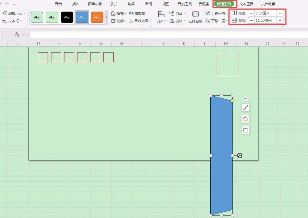 4、选中该梯形,在绘图工具栏中找到【高度】和【宽度】的微调框,将高度调整为【2厘米】,宽度调整为【11厘米】。