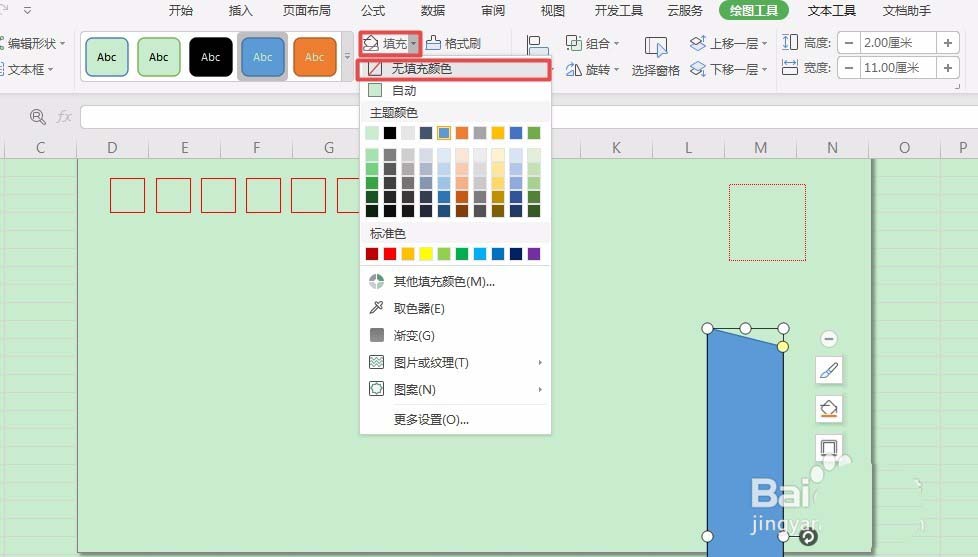 5、在绘图工具栏中点击【填充】右面的倒三角,在下拉列表中选择【无填充颜色】。