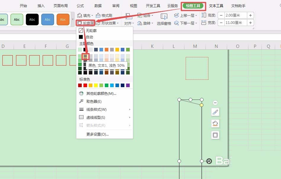 6、在绘图工具栏中点击【轮廓】右面的倒三角。在下拉列表里选择【黑色,文本1,浅色50%】。